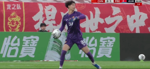 上半场补时第2分钟,U23国足门将姚浩洋手抛球,直接把球扔出界外。